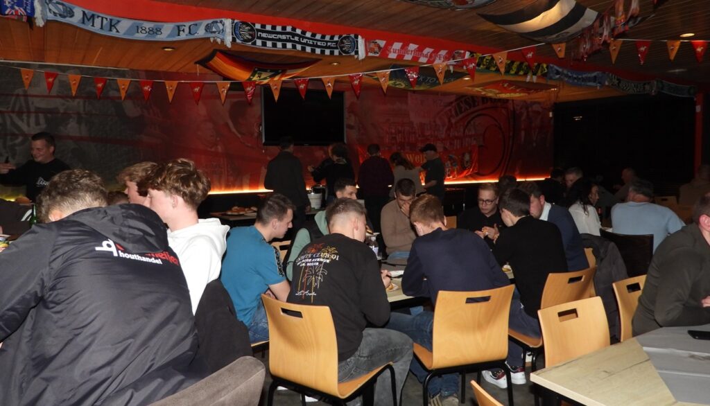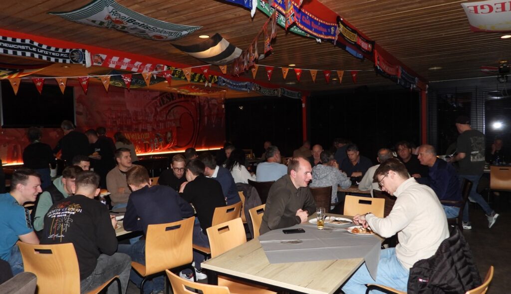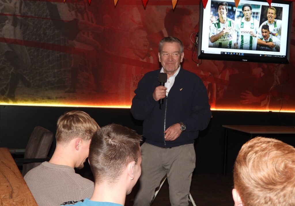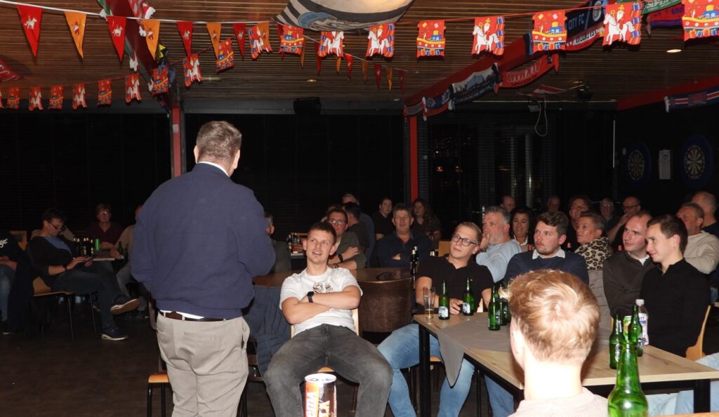 Voorzitter Douwe Dam was helaas verhinderd. Nadat er een bodem was gelegd, kwam spreker Hans Nijland (voormalig directeur van FC Groningen) aan het woord en vertelde boeiende verhalen over het tot stand komen van de transfers met Virgil van Dijk en Luis Suarez en er volgden nog meer anekdotes. Deze verhalen zijn ook te vinden in zijn boek “Hans Nijland, Boerenbluf op de Transfermarkt”. Piet de Boer was de gelukkige, die een vraag over Marianne Timmer juist wist te beantwoorden en als prijs een gratis boek ontving en ook nog op de foto ging met de dochter van Hans Nijland, Daantje. Het boek vond na afloop ook aftrek onder de toehoorders en voor iedereen schreef Nijland een persoonlijk woordje in het boek. Mient Mulder en Henkie Machiela sloten deze avond af met een hilarische bingo. Er kon teruggekeken worden op een geslaagde avond.